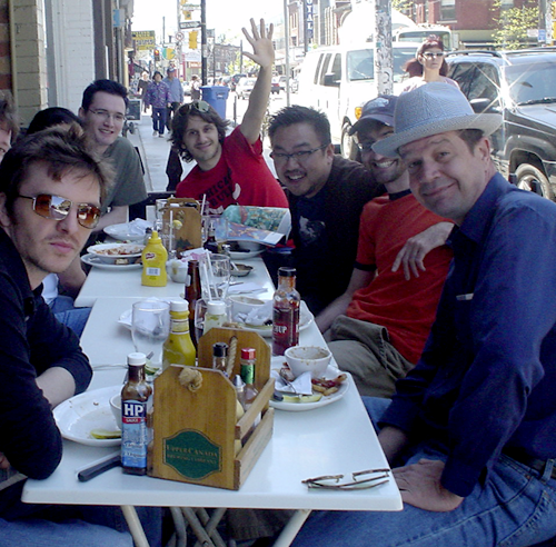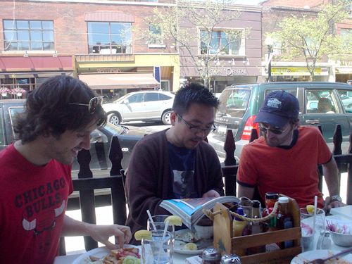 Cho and I have worked together before, in one-page comics for the Toronto Comic Arts Festival (TCAF) comic, and in a window display at a local bookstore. The other day at lunch he mentioned that he thinks my skills are better suited to being an art director or editor, since I have more love for ideas than their execution, and can put my critical eye into clear words. I take that as a compliment. Mike was part of a group of us that used to get together every Wednesday for lunches. It was nicknamed Superman Club. It was a fun few hours to talk about what was happening in comics, and storytelling mediums in general. But Mike, like me, is busy being a new dad, and several people moved out of town so there aren’t so many of us left to lunch anymore. Two of the other Superman Clubbers, Steven Charles Manale and Jason Bone make cameos on the tombstones in this strip. Isn’t Bone the perfect name for a tombstone? Here’s Manale, Cho and Bone dissecting the finer points of comics.